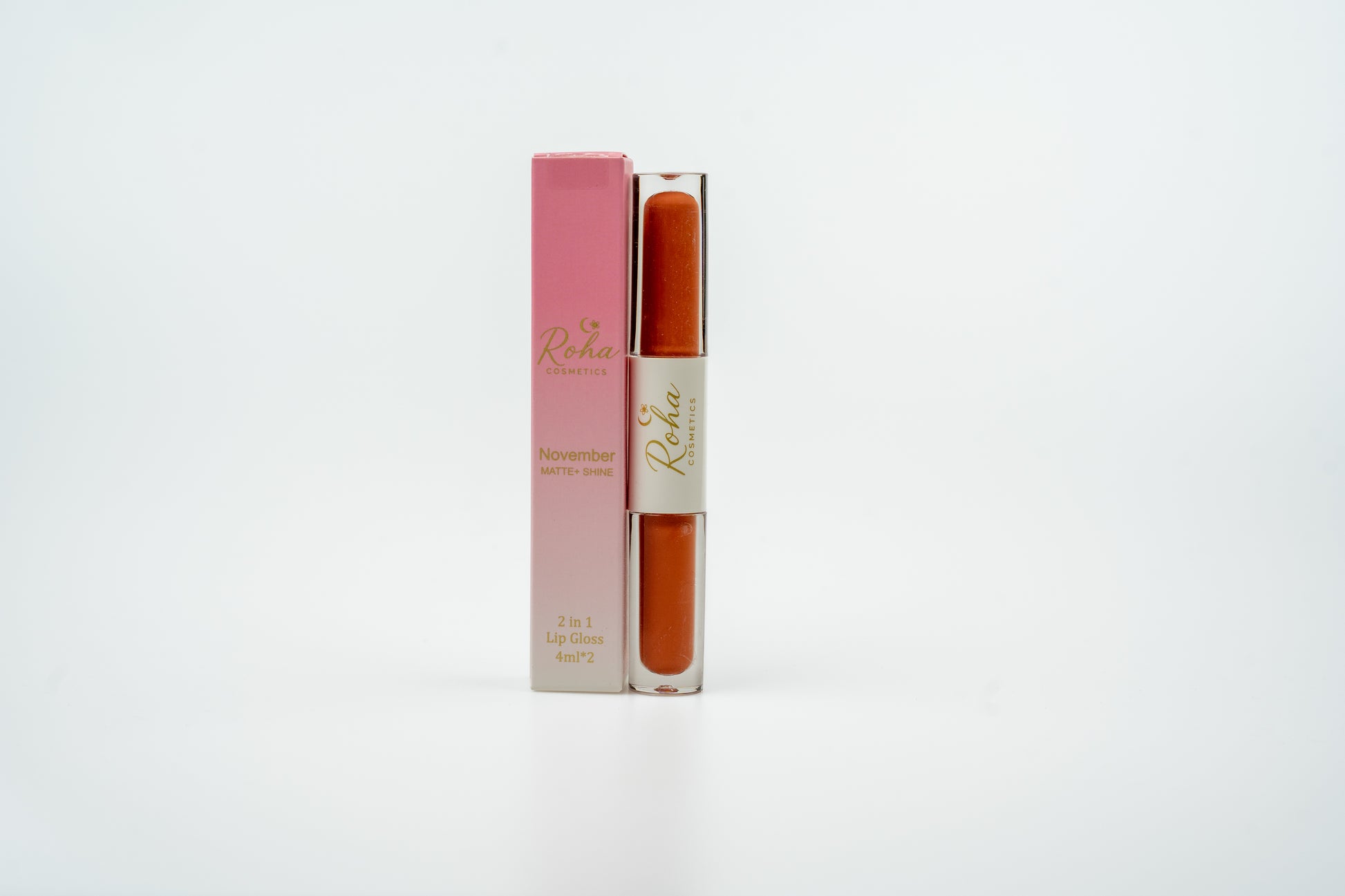 November Matte+Shine 2 în 1 Lip Gloss oferă buzelor o nuanță intensă și rafinată de Brown Shine, aplicată în doi pași: