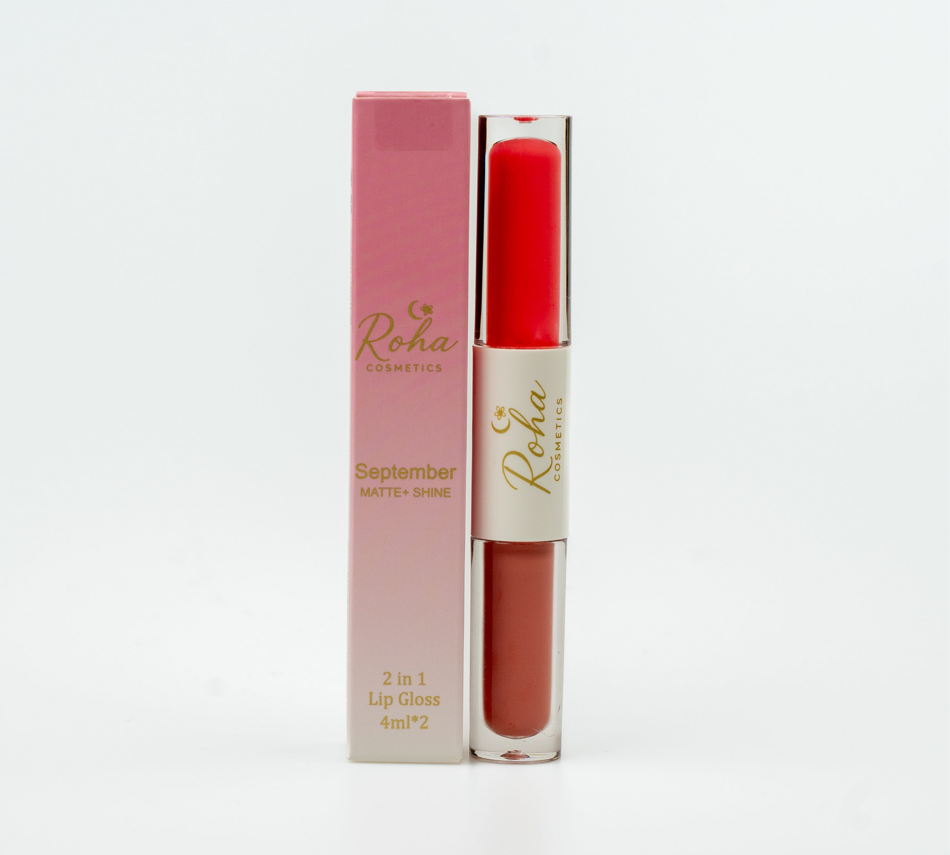 September Matte+Shine 2 în 1 Lip Gloss oferă buzelor o culoare elegantă de Dusty Pink, completată de un luciu delicat Pink Shine, prin aplicarea în doi pași: